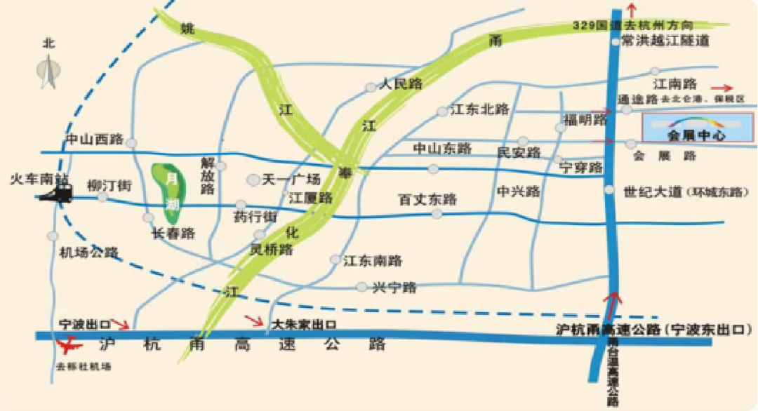 駕車自杭滬甬高速及甬臺溫高速,至寧波東收費站出口,經世紀大道向北至通途路,右轉,即達寧波國際會展中心北門。